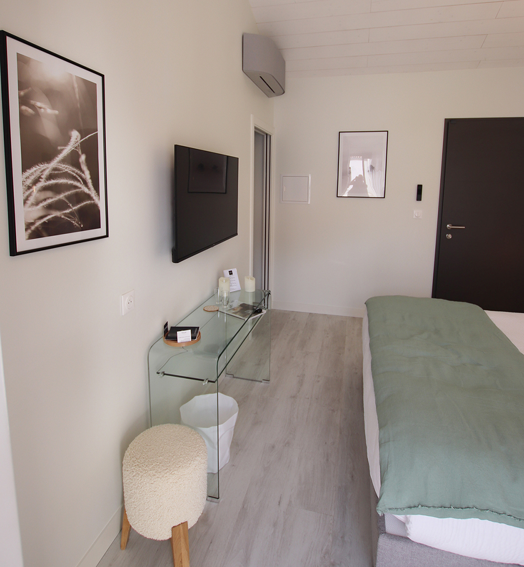 Retrouvez dans cette chambre et salle de bain de 19 m2 : climatisation, WiFi gratuit, télévision, lit king size (180 x 200) ou possibilité de deux lits de 90 x 200, porte-bagages. Dans votre salle de bain avec toilettes privatives, nous mettons à votre disposition des serviettes, des draps de bain, l’essentiel pour la douche (gels douche et shampoings de la marque Muzzü) ainsi qu’un sèche-cheveux. Accès direct à la piscine et au hammam.