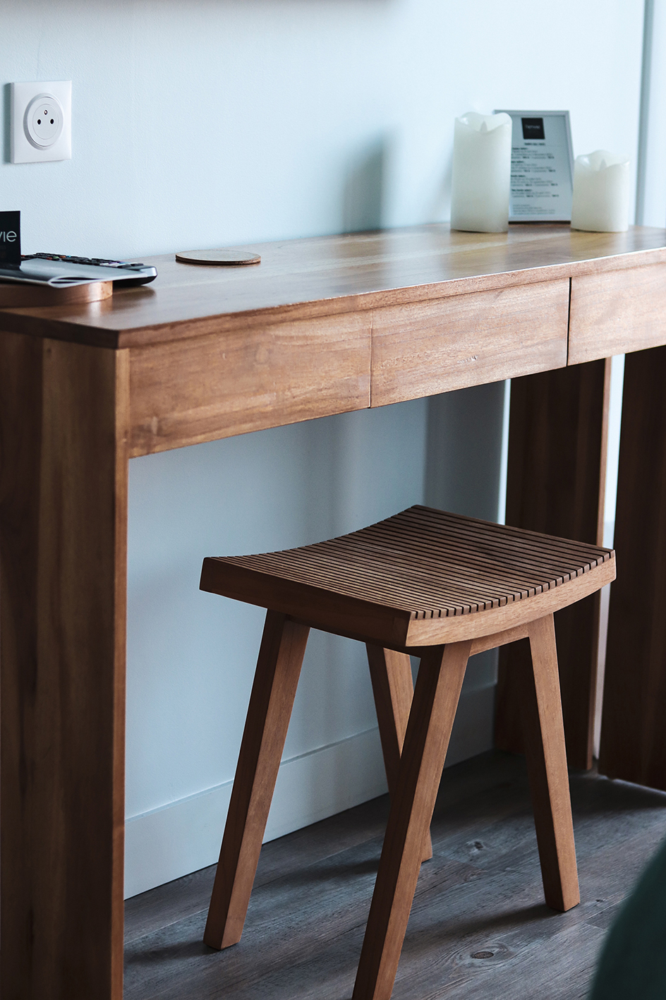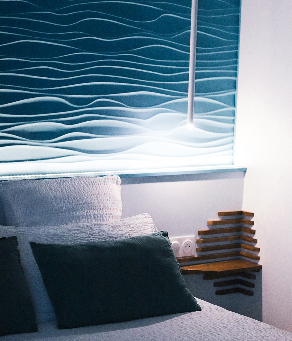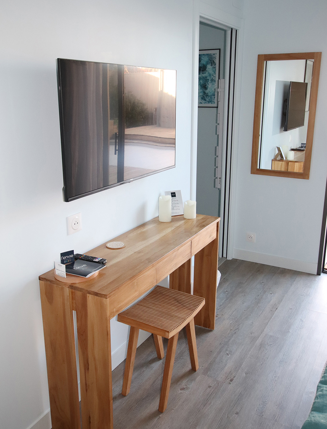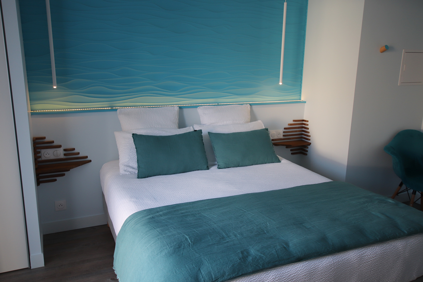 Flottez et immergez-vous dans cet univers. Les vagues vous transportent avec légèreté dans cette atmosphère iodée. Conçue pour 2 personnes, cette chambre est une invitation à prendre le large. Cet ensemble, chambre et salle de bain de 18 m2, dispose de nombreux équipements : climatisation, WiFi gratuit, télévision, grand lit (160 x 200), porte-bagages. Dans cette salle de bain avec toilettes privatives, nous mettons à votre disposition des serviettes, des draps de bain, l’essentiel pour la douche (gels douche et shampoings de la marque Muzzü) et un sèche-cheveux. Accès direct à la piscine et au hammam.